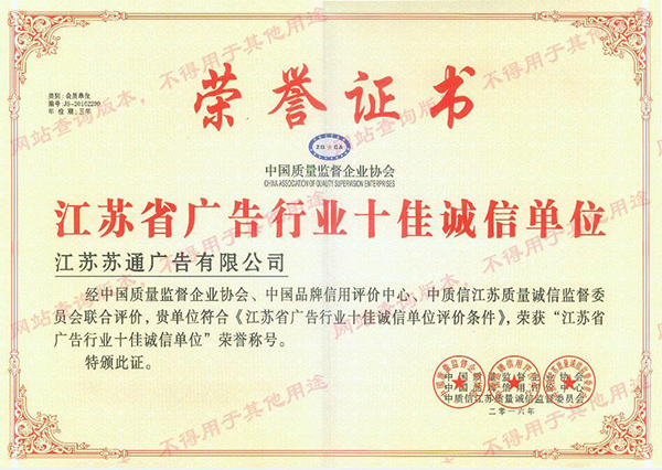 由中國質(zhì)量監(jiān)督企業(yè)協(xié)會、中國品牌信譽評價中心、中質(zhì)信江蘇質(zhì)量誠信監(jiān)督委員會對江蘇省企業(yè)的誠信建設(shè)和品牌塑造進行評估和考察,通過綜合評分和數(shù)據(jù)的評估,評選出江蘇十佳誠信品牌企業(yè),在江蘇省多家知名企業(yè)的競爭中,我們蘇通廣告有限公司脫穎而出,最終成功當(dāng)選為“江蘇省廣告恒業(yè)十佳誠信單位”,以下是我公司當(dāng)選的證書: